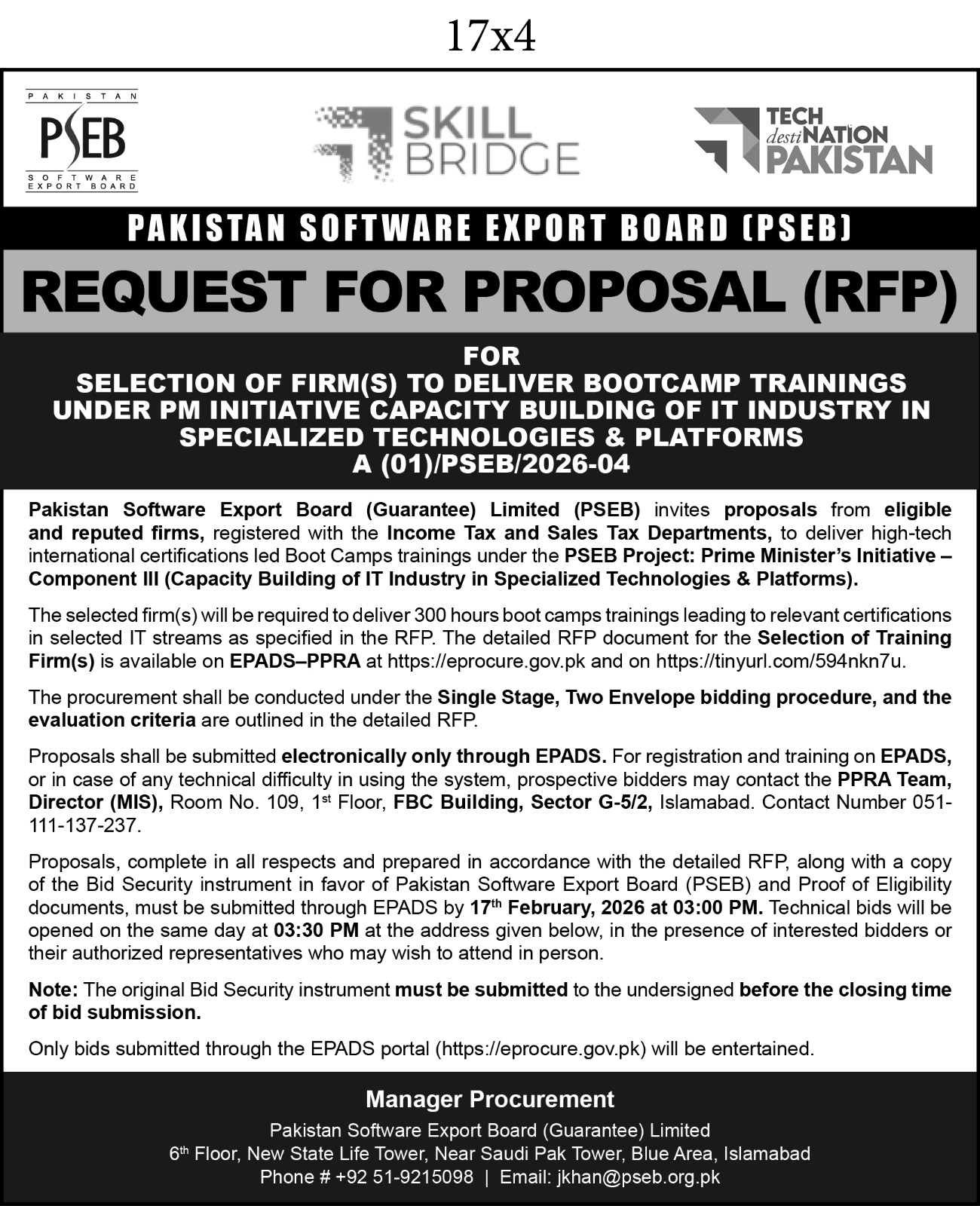 Proposals must be submitted electronically via the EPADS portal by the deadline of 17th February 2026 at 3:00 PM. Technical bids will be opened the same day at 3:30 PM at PSEB's office located on the 6th Floor, New State Life Tower, Blue Area, Islamabad. Only bids submitted through EPADS will be entertained.