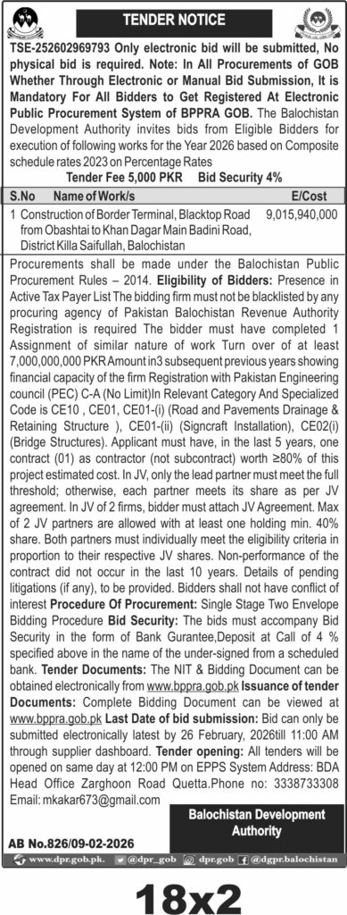 The deadline for electronic bid submission is **26 February 2026 at 11:00 AM**, with tender opening at **12:00 PM** the same day via the Electronic Public Procurement System (EPPS). Bidders can obtain and view bidding documents online at www.bppra.gob.pk. The physical address for correspondence is BDA Head Office, Zarghoon Road, Quetta.
