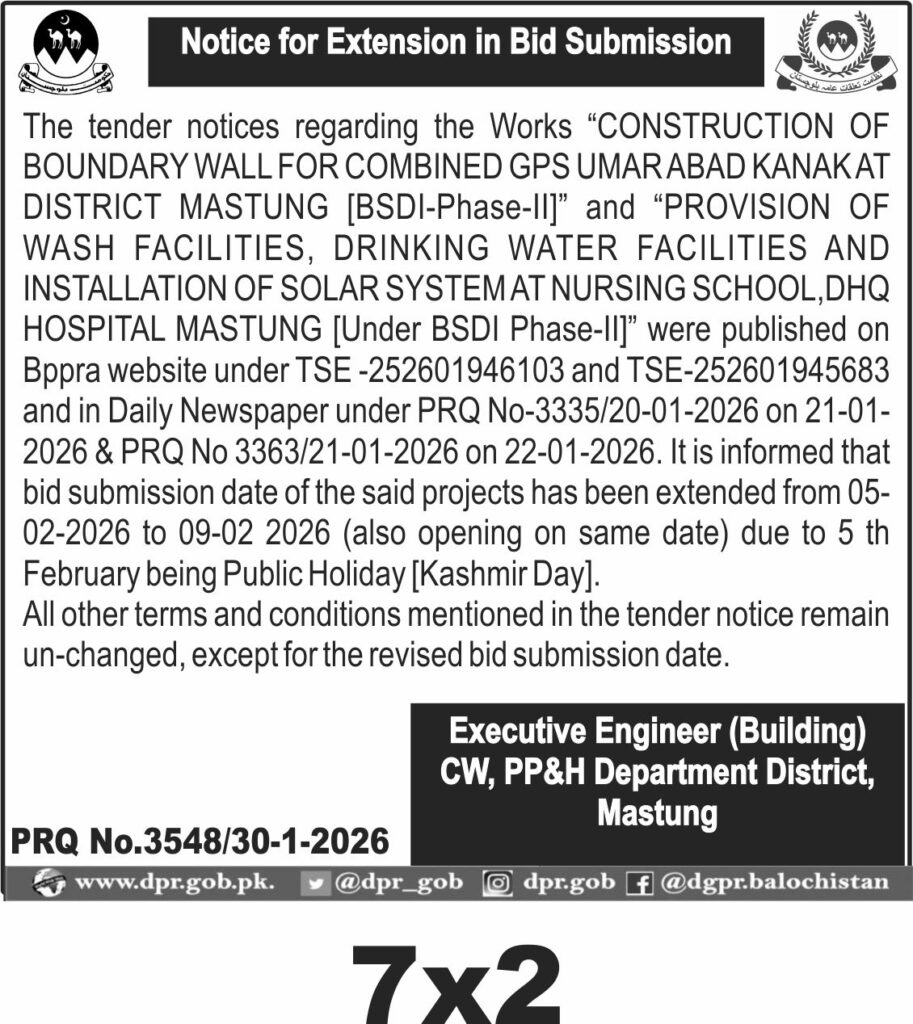 The extended submission deadline is set for 09-February-2026, with bid opening on the same day. Interested parties must submit sealed bids physically at the office of the Executive Engineer (Building), CW, PP&H Department District Mastung. Timely submission is crucial due to the public holiday on 5th February 2026, which caused the extension.