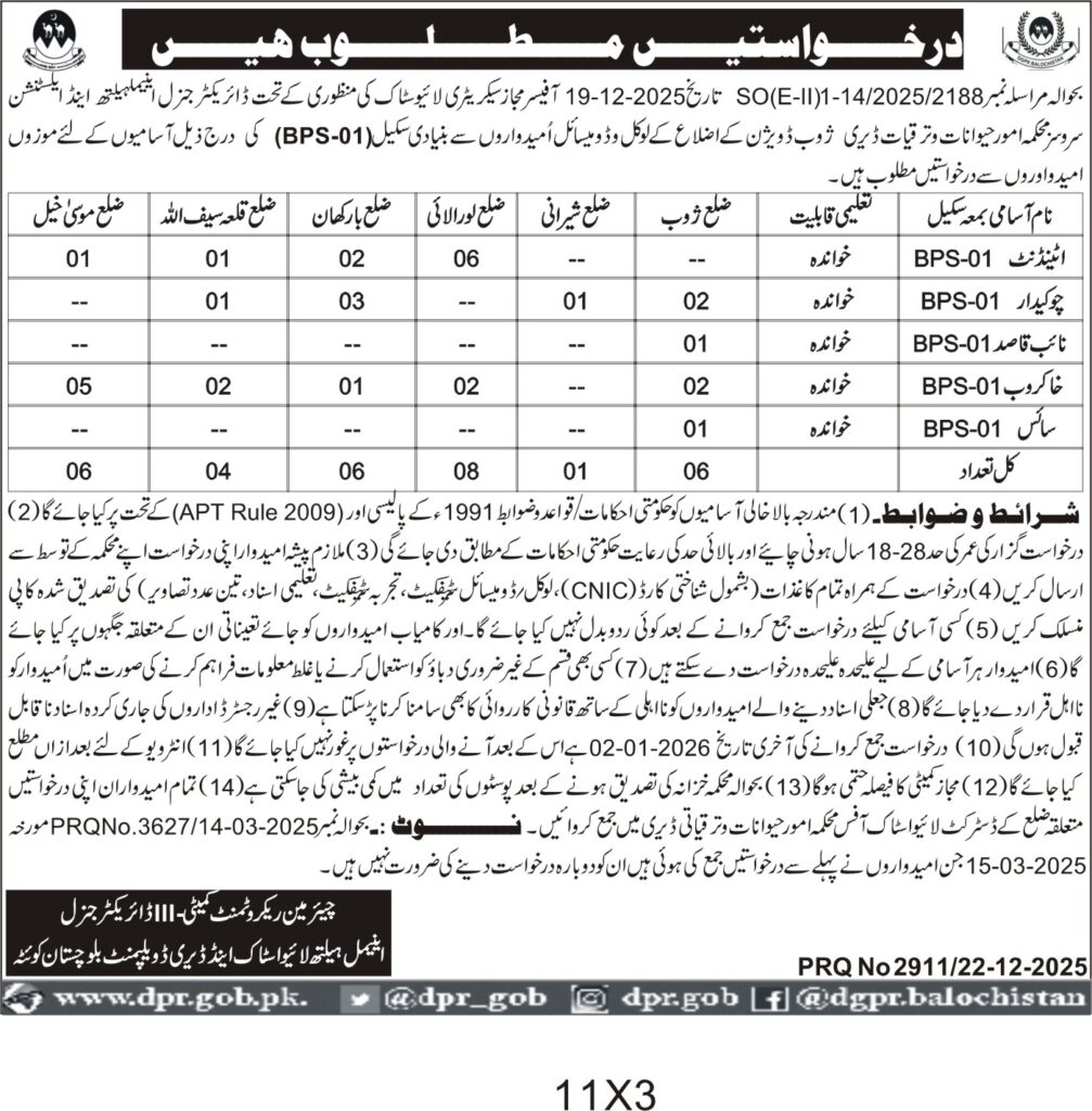 The General Administration and Establishment Department Balochistan invites applications for recruitment of BPS-01 positions in various districts including Quetta, Loralai, Barkhan, and others. The recruitment is for multiple posts such as attendant, chowkidar, naib qasid, and others in Balochistan.
