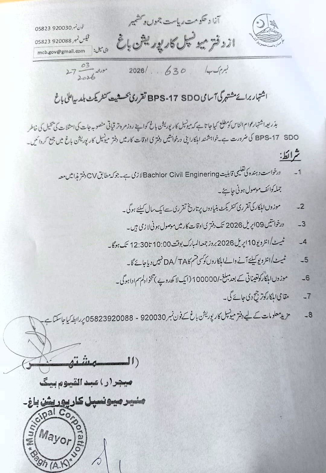 This tender invites applications for the position of BPS-17 Sub-Divisional Officer (SDO) Civil Engineer at Municipal Corporation Bagh, Azad Jammu & Kashmir. The role is critical for overseeing daily progress and ensuring the successful execution of ongoing development projects within the municipal limits of Bagh.
