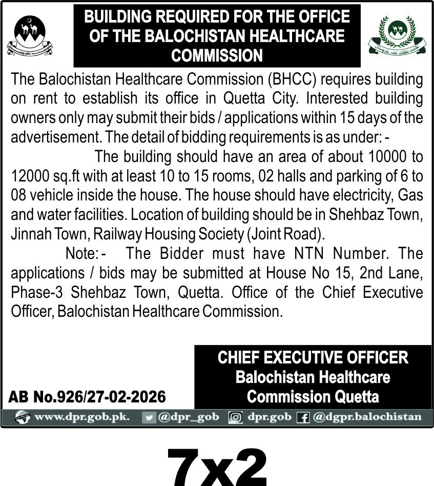 The submission deadline is within 15 days from the advertisement date, with bids to be submitted physically at House No 15, 2nd Lane, Phase-3 Shehbaz Town, Quetta. The office of the Chief Executive Officer, Balochistan Healthcare Commission, will handle the bid opening and evaluation process.