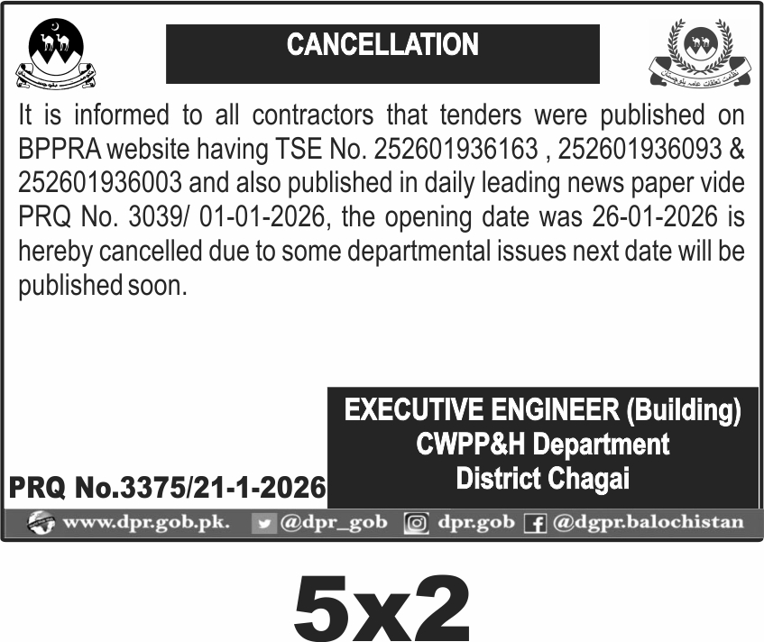The new tender dates and submission details will be communicated soon. Contractors are advised to monitor official channels closely and prepare their documentation accordingly. The original tender opening was set for 26th January 2026, with submissions likely required at the CWPP&H Department office in District Chagai.