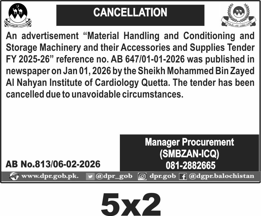 This notice concerns the cancellation of the tender for Material Handling and Conditioning and Storage Machinery and their Accessories and Supplies for the fiscal year 2025-26 in Quetta by the Sheikh Mohammed Bin Zayed Al Nahyan Institute of Cardiology. The tender was initially published on January 1, 2026, but has now been withdrawn due to unavoidable circumstances.