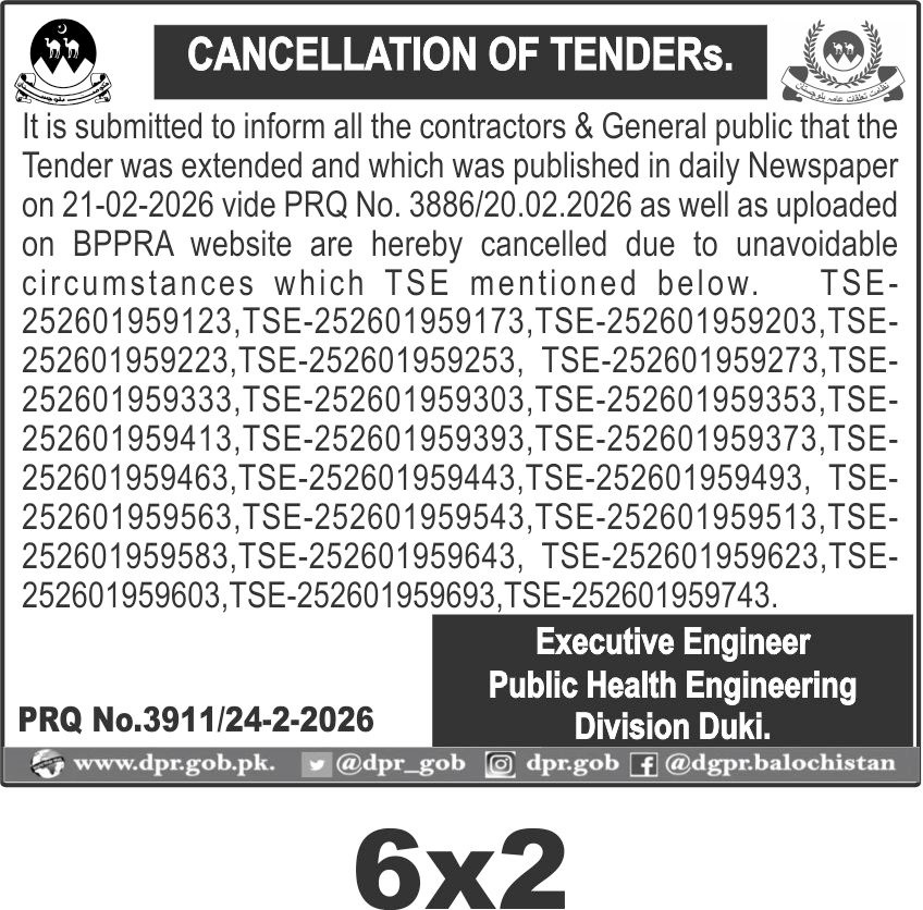 This notice from the Public Health Engineering Division Duki, Balochistan, informs contractors and the general public about the cancellation of multiple tenders originally published on 21-02-2026. The cancellation affects several tenders identified by their TSE numbers, reflecting unavoidable circumstances that have led to this decision.