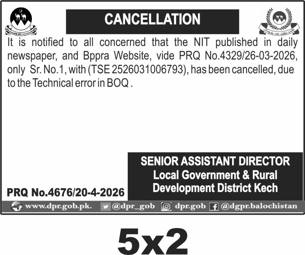 The Local Government and Rural Development Department of District Kech has issued a cancellation notice for the previously published NIT under PRQ No.4329/26-03-2026. This cancellation is due to a technical error found in the Bill of Quantities (BOQ) related to Sr. No.1 with reference TSE 2526031006793. The notice was disseminated through daily newspapers and the Balochistan Public Procurement Regulatory Authority (BPPRA) website.
