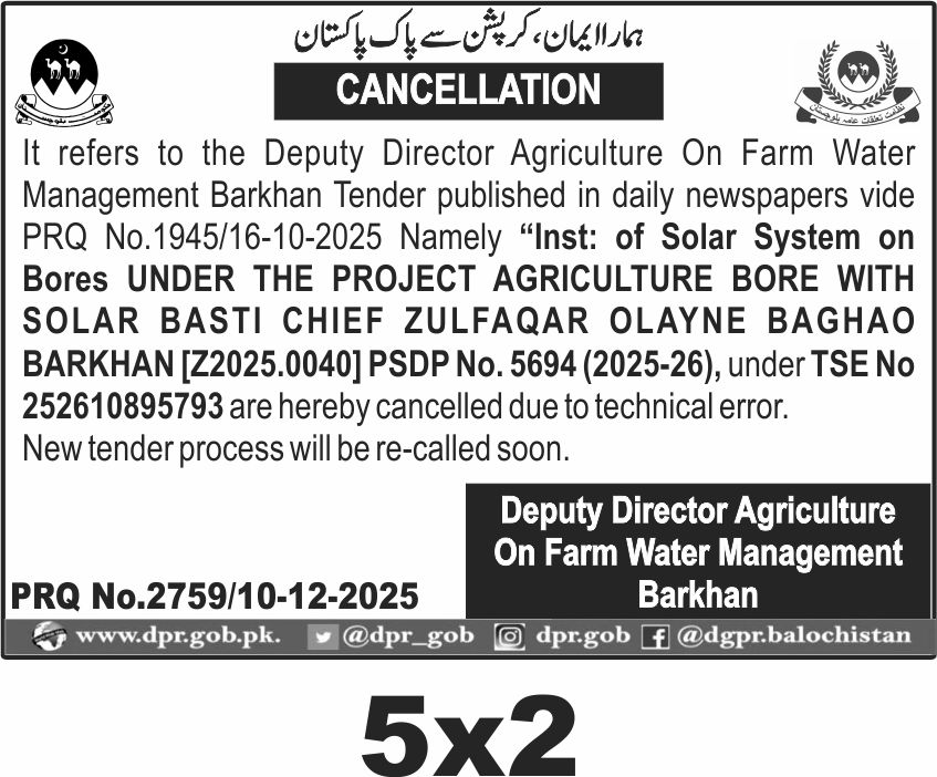 The original tender was published under PRQ No.1945/16-10-2025 and PSDP No. 5694 (2025-26) with TSE No 252610895793. The cancellation is announced by the Deputy Director Agriculture On Farm Water Management Barkhan.