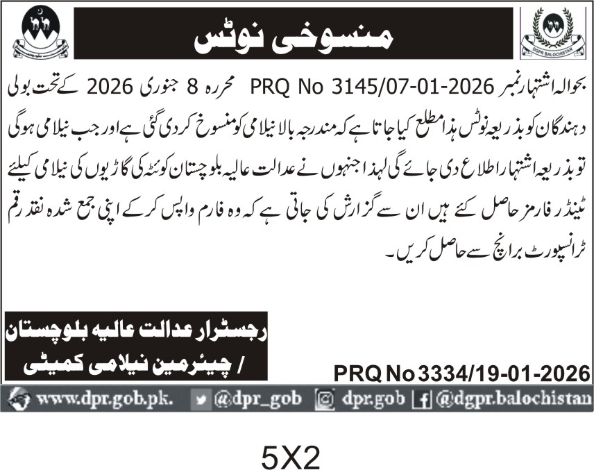 This notice from the Registrar High Court Balochistan in Quetta announces the cancellation of the tender for transportation services related to the auctioned vehicles (nilaami cars). The department had initially invited bids for transporting these vehicles but has now officially withdrawn the tender as per the directive dated 8th January 2026.