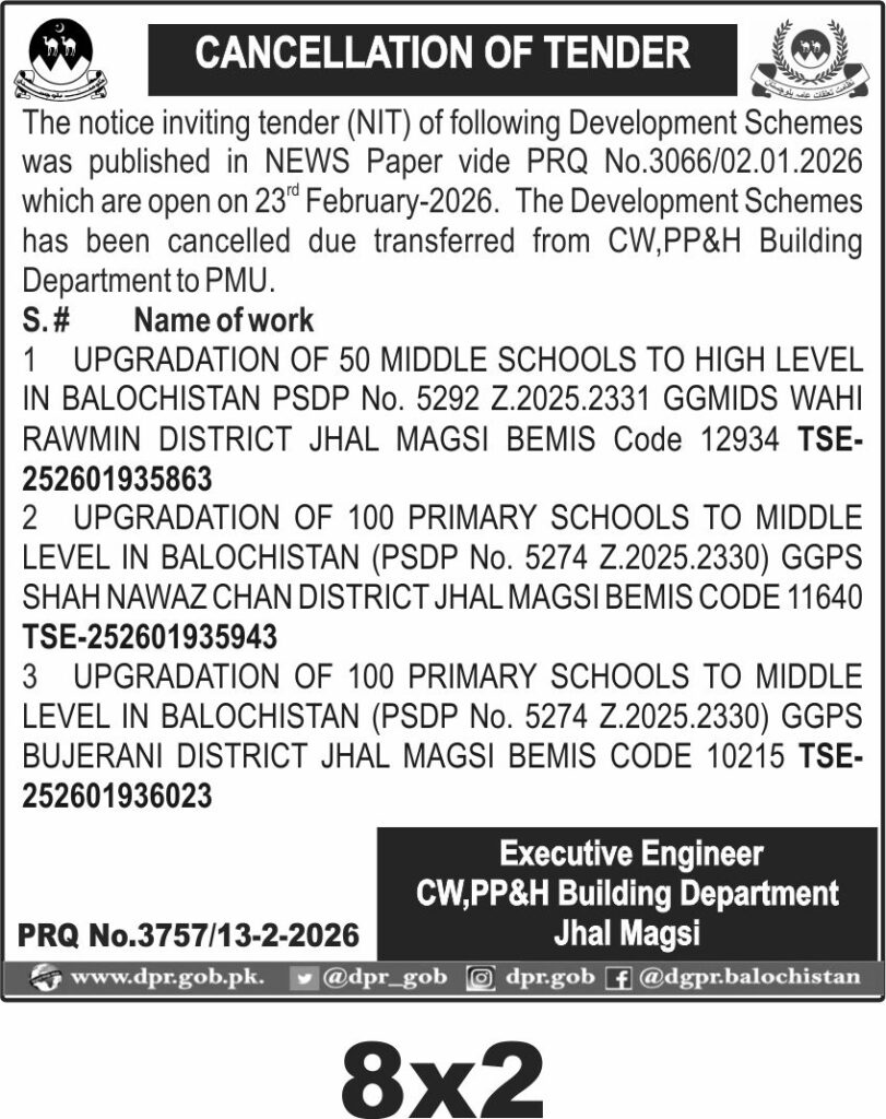 This notice concerns the cancellation of development schemes for school upgradation in Jhal Magsi, Balochistan, issued by the Civil Works, Public Parks & Housing Building Department. The projects involved upgrading 50 middle schools to high level and 200 primary schools to middle level across various districts in Balochistan.