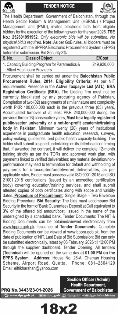 This tender from the Health Department, Government of Balochistan, invites electronic bids for a Capacity Building Program targeting paramedics and allied healthcare providers in Quetta. The project focuses on enhancing skills and knowledge through a structured 12-month training program designed to improve healthcare delivery standards in the region.