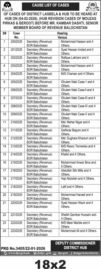 This notice from the Board of Revenue Balochistan announces the cause list of cases for District Lasbela and Hub to be heard at Hub on 4th February 2026. The cases pertain to revision matters involving mouzas Pirka and Beroot, overseen by Senior Member Board of Revenue Balochistan, Mr. Kambar Dashti. The hearing schedule includes multiple cases where the Secretary (Revenue) BOR Balochistan is the petitioner against various respondents.