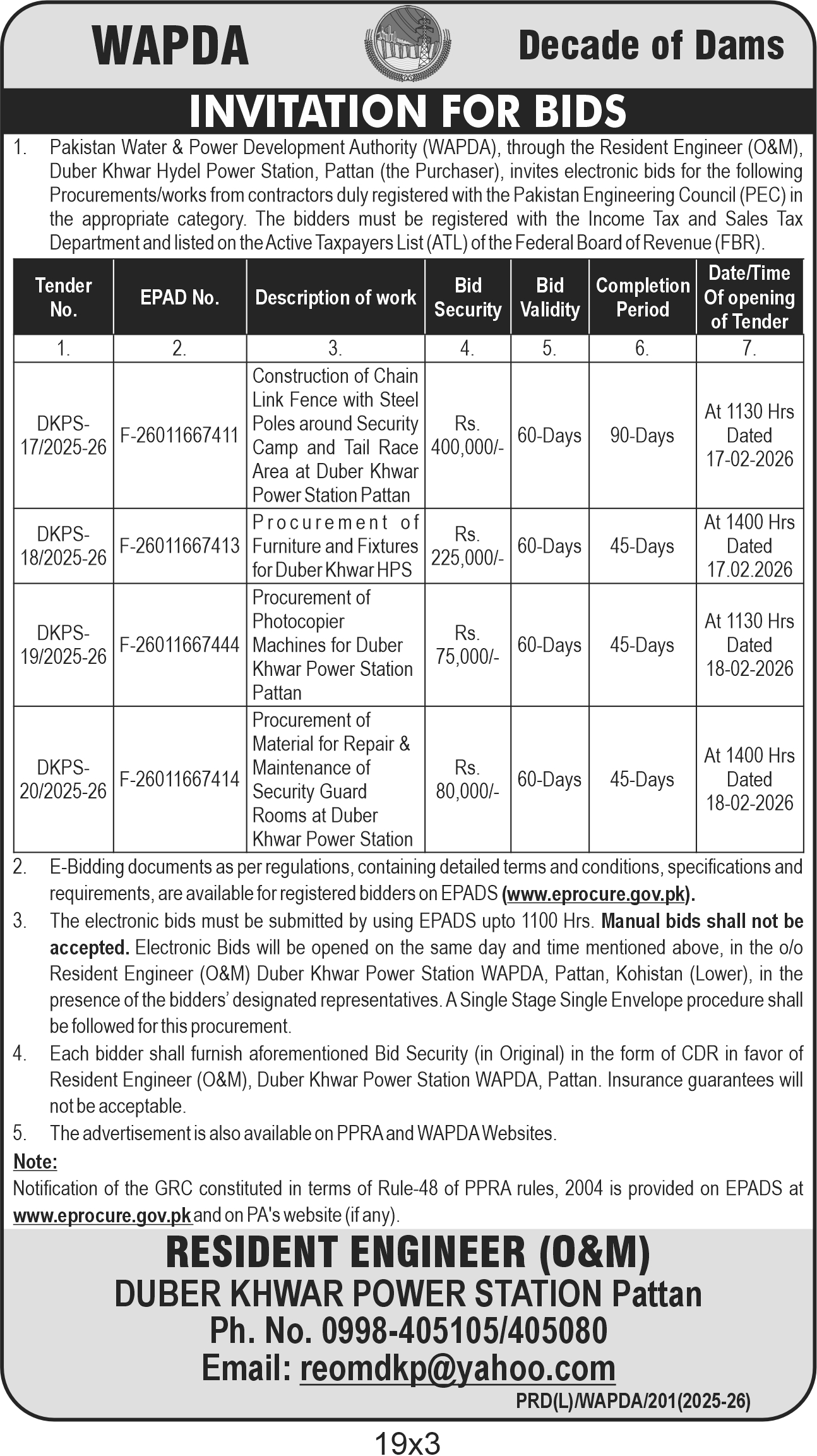 The submission deadline for electronic bids is by 1100 Hrs on the respective dates, with tender openings scheduled at 1130 Hrs or 1400 Hrs on 17th and 18th February 2026 at the office of the Resident Engineer (O&M), Duber Khwar Power Station, Pattan. Bidders must submit bids through the EPADS online portal; manual bids will not be accepted.