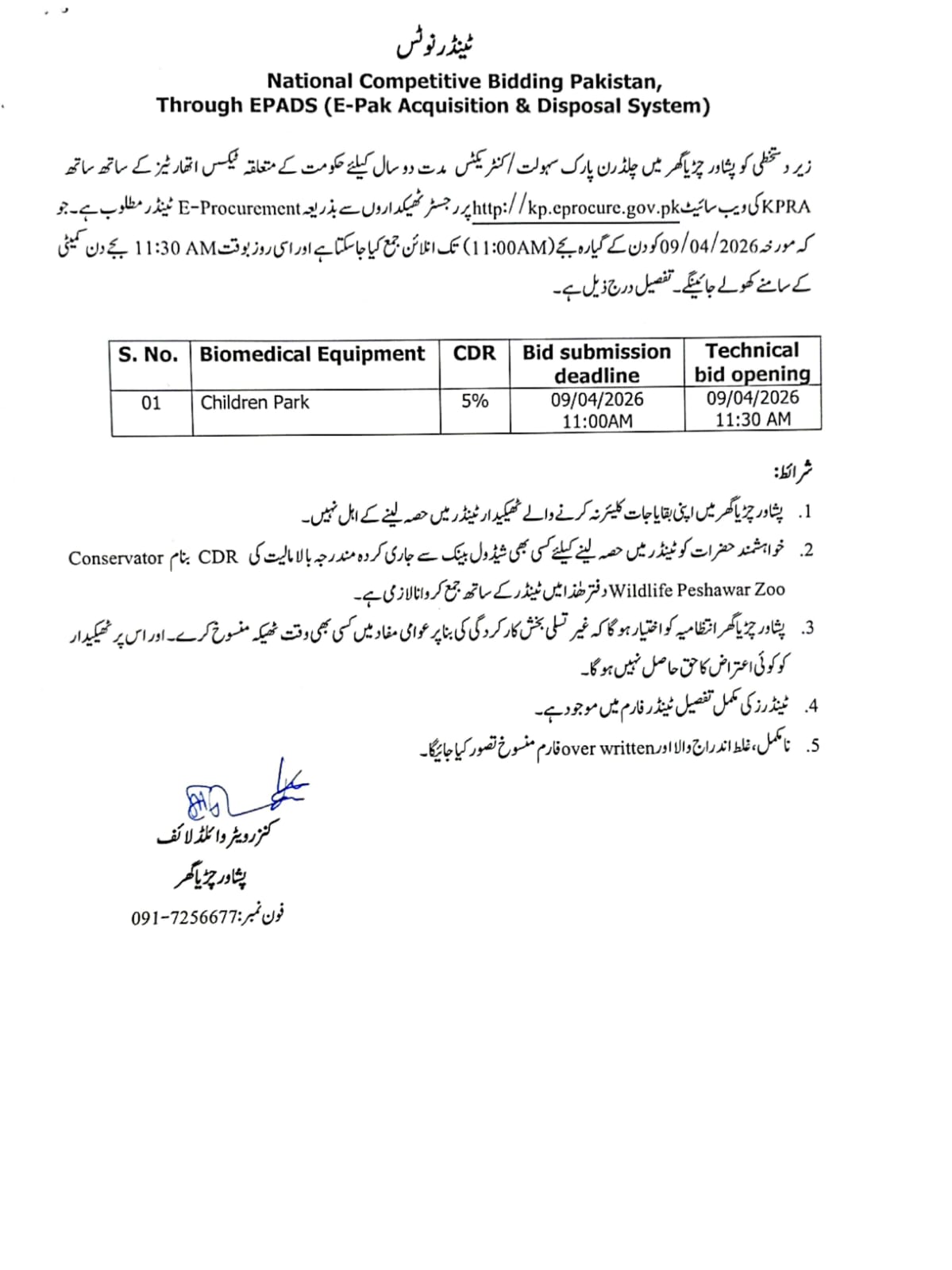 The scope involves supplying specialized children park equipment suitable for a zoological environment, emphasizing safety standards and compliance with local regulations. The site is located in Peshawar, where climatic and environmental factors must be considered to ensure longevity and minimal maintenance. The technical bid opening is scheduled shortly after the submission deadline, allowing for prompt evaluation.