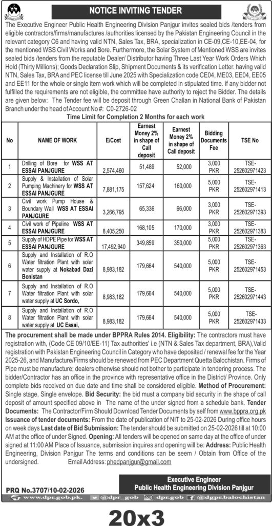 This tender invites bids from qualified contractors and dealers for civil works and solar pumping systems related to the Water Supply Scheme (WSS) at Essai Panjgur and Nokabad Dazi Bonistan in Panjgur, Balochistan. The Public Health Engineering Division Panjgur requires specialized construction and installation services including drilling of bores, civil works for pump houses and boundary walls, pipeline installation, and supply of HDPE pipes. Additionally, the tender covers supply and installation of solar pumping machinery and reverse osmosis (R.O) water filtration plants with solar water supply at multiple locations.