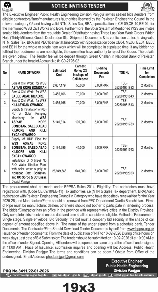 Submission deadline is on 10th February 2026 by 10:00 AM, with bid opening at 11:00 AM the same day at the Public Health Engineering Division Panjgur office. Tender documents are downloadable from www.bppra.org.pk. Interested bidders should ensure timely submission and adherence to all eligibility criteria.