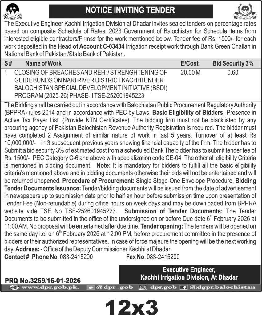 This tender invites contractors in Dhadar, Balochistan, under the Pakistan Water and Power Development Authority (WAPDA), Kachhi Irrigation Division, for civil works focused on river embankment protection. The project involves closing breaches and strengthening guide bunds on the Nari River, a critical task to prevent flooding and safeguard agricultural lands under the Balochistan Special Development Initiative (BSDI) for the 2025-26 fiscal year. The estimated cost is PKR 20 million, reflecting the scale and importance of the work.