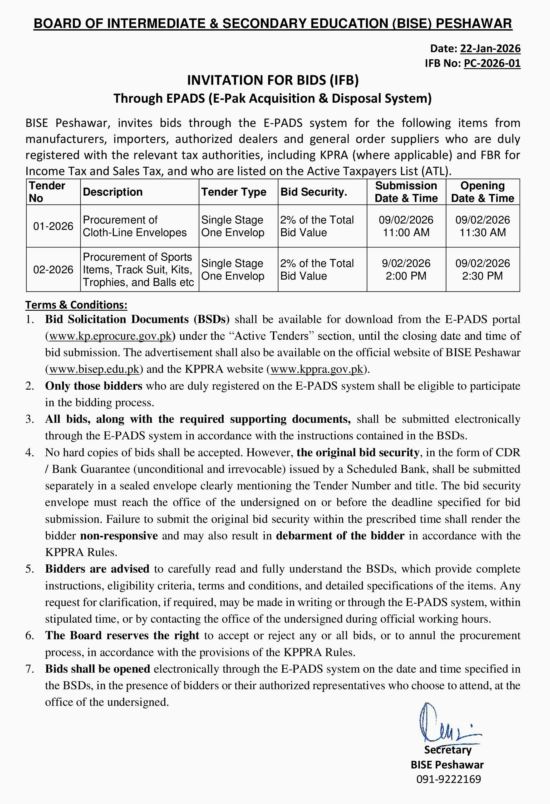 The submission deadline is set for 09 February 2026, with the cloth-line envelopes bid closing at 11:00 AM and sports items at 2:00 PM. Bid opening follows shortly after submission times at the BISE Peshawar office. All bids must be submitted electronically via the E-PADS portal, with original bid security physically delivered before the deadline.