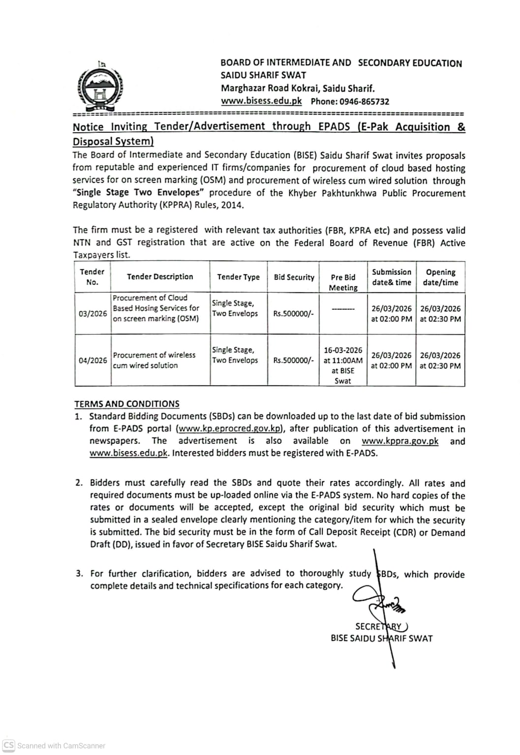 Submission deadline is set for 26th March 2026 at 2:00 PM, with bid opening at 2:30 PM the same day. Bids must be submitted via the E-PADS portal, with original bid security documents physically delivered in sealed envelopes to the BISE Saidu Sharif office on Marghazar Road, Kokrai.