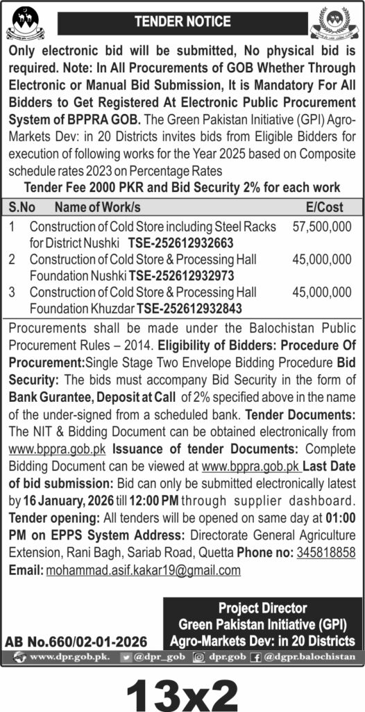 This tender invites bids for the construction of cold stores including steel racks and processing hall foundations in the districts of Nushki and Khuzdar, Balochistan. The Green Pakistan Initiative (GPI) Agro-Markets Development project aims to enhance agricultural storage and processing infrastructure across 20 districts, with this specific work focusing on durable cold storage facilities to support local produce preservation and market readiness.