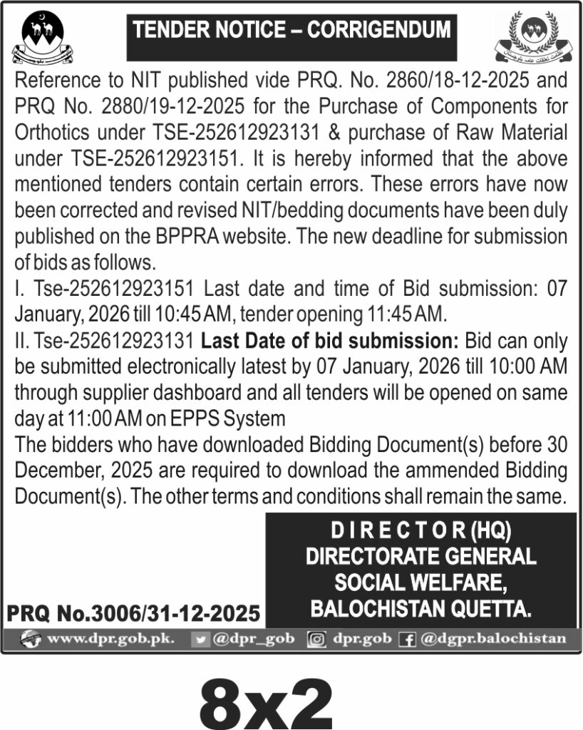 The final submission deadline is set for 07 January 2026 at 10:45 AM, with the tender opening scheduled at 11:45 AM on the same day. Bids must be submitted electronically via the EPPS system, and bidders who downloaded earlier documents before 30 December 2025 are required to download the amended versions to avoid disqualification. The physical office for any inquiries is the Directorate General Social Welfare, Quetta.