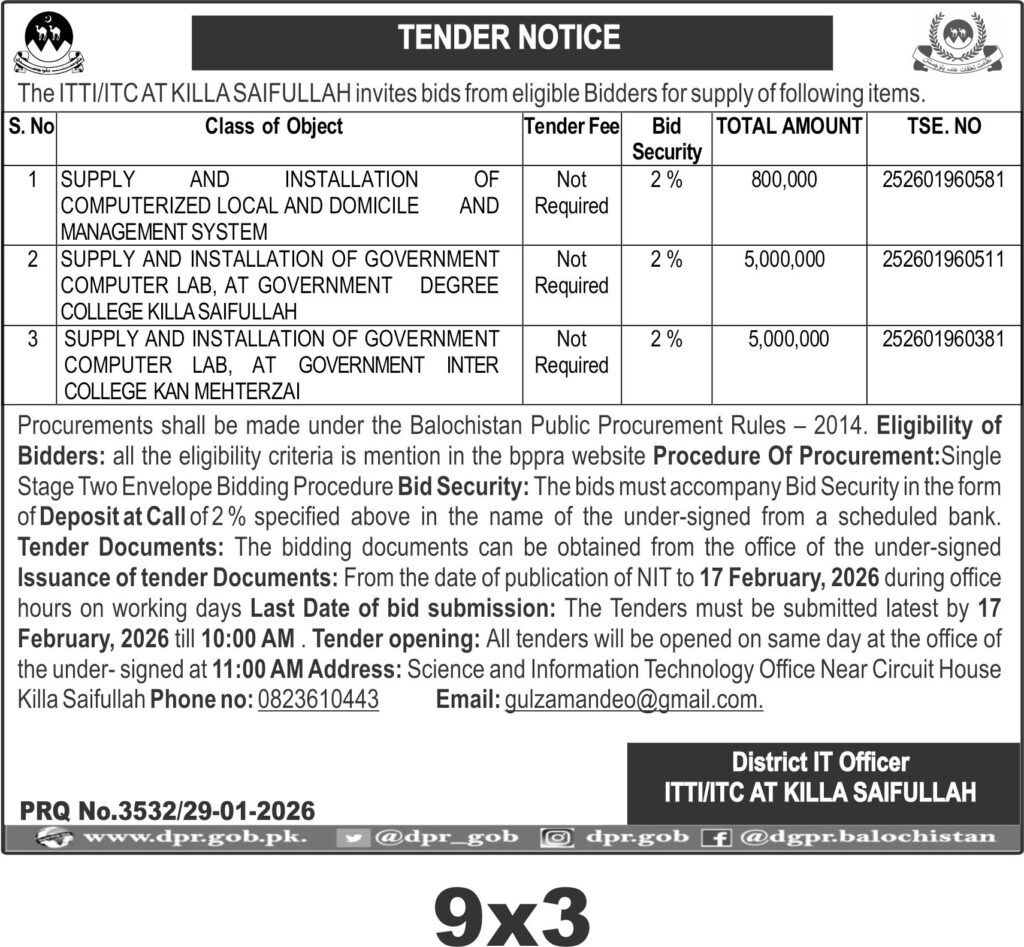 This tender invites bids for the supply and installation of a computerized local and domicile management system along with government computer labs at two educational institutions in Killa Saifullah, Balochistan. The District IT Officer requires qualified vendors to provide and install advanced IT infrastructure to enhance administrative and educational capabilities in the region. The scope includes setting up a computerized management system and fully equipped computer labs at the Government Degree College and Government Inter College Kan Mehterzai.