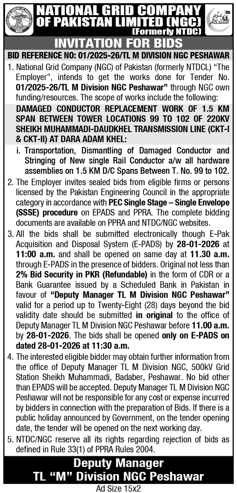 The submission deadline is set for 28th January 2026 at 11:00 a.m., with bid opening scheduled the same day at 11:30 a.m. All bids must be submitted electronically through the E-Pak Acquisition and Disposal System (E-PADS). Original bid securities must be delivered physically to the Deputy Manager TL M Division NGC Peshawar office before the deadline. The office is located at the 500kV Grid Station Sheikh Muhammadi, Badaber, Peshawar.