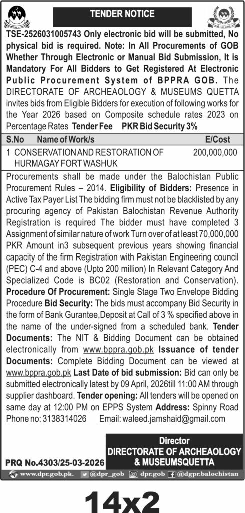 The submission deadline is set for 09 April 2026 at 11:00 AM, with tender opening scheduled the same day at 12:00 PM on the EPPS system. The physical address for correspondence is Spinny Road, Quetta. Interested bidders should ensure compliance with all PEC and FBR requirements for the fiscal year 2025-26 to avoid disqualification.