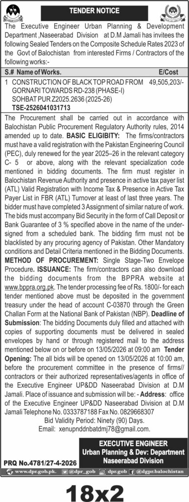The Urban Planning and Development Department Naseerabad Division at D.M Jamali is procuring the construction of a black top road from Gornari towards RD-238 Phase-I in Sohbat Pur. This project is part of the Composite Schedule Rates 2023 of the Government of Balochistan and involves significant civil works for road infrastructure.