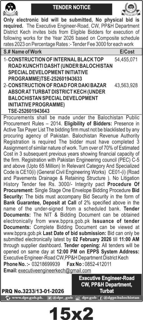 The submission deadline is set for 02 February 2026 at 11:00 AM, with electronic bids only accepted via the supplier dashboard. Tender opening will follow at 12:00 PM the same day on the EPPS system. The physical address for correspondence is the Executive Engineer-Road CW, PP&H Department, District Kech, Turbat.