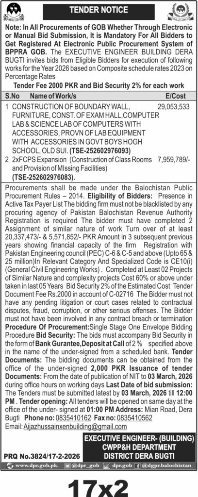 The submission deadline is set for 03 March 2026 at 12:00 PM, with tender opening at 01:00 PM on the same day. Bidders can obtain tender documents from the office at Mian Road, Dera Bugti, during office hours. A tender fee of PKR 2,000 and bid security of 2% of the estimated cost are required, payable via bank guarantee or call deposit receipt from a scheduled bank.