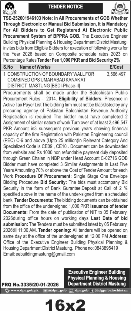 The submission deadline is set for 05 February 2026 at 11:00 AM, with tender opening at 12:00 PM the same day at the office of the Executive Engineer Building Physical Planning & Housing Department District Mastung. Bidders should prepare their technical and financial bids in a sealed envelope as per the single stage one envelope bidding procedure.