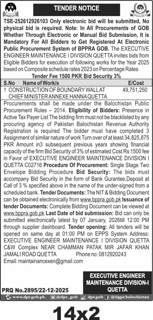 Tender documents are available electronically at www.bppra.gob.pk. Bids must be submitted electronically by 07 January 2026 at 12:00 PM. The tender opening will occur the same day at 01:00 PM at the Executive Engineer Maintenance Division I Quetta office. Eligibility and registration requirements apply.