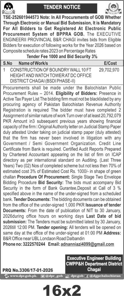 The last date for bid submission is 30 January 2026 by 12:00 PM, with tender opening scheduled the same day at 1:00 PM at the B&R Office near UBL Londaon Road Dalbandin. Tender documents can be obtained during office hours until the submission deadline.