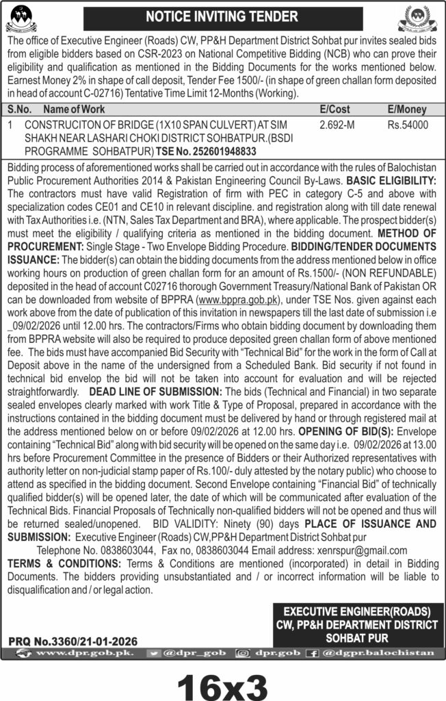 Contractors should ensure their PEC registration and tax documentation are current and valid for the fiscal year 2025-26. The bid validity period is ninety days. The submission deadline is strictly by 12:00 PM on 9th February 2026, with technical bids opening at 1:00 PM the same day. Bids must be submitted in sealed envelopes clearly marked with the work title and proposal type, either by hand or registered mail to the Executive Engineer (Roads) office in Sohbatpur.