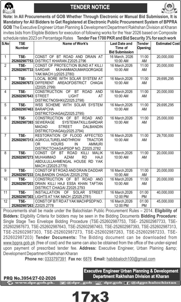 The submission deadline is set for 16 March 2026 at 10:00 AM, with tender opening scheduled at 11:00 AM on the same day. Bidders must submit sealed bids physically to the Executive Engineer, Urban Planning & Development Department Rakhshan Division, Kharan. Interested parties should carefully review the bidding documents and eligibility criteria to ensure full compliance.
