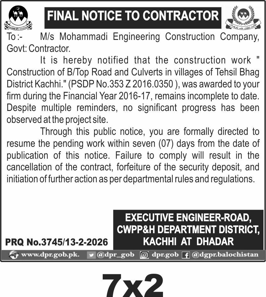 The deadline to resume work is within seven days from the date of this notice, with the final submission and opening of any related documentation expected by 23:59:59 on 20th February 2026. Interested parties should coordinate with the Executive Engineer-Road at the CWPP&H Department District Kachhi office in Dhadar for further details and submission.