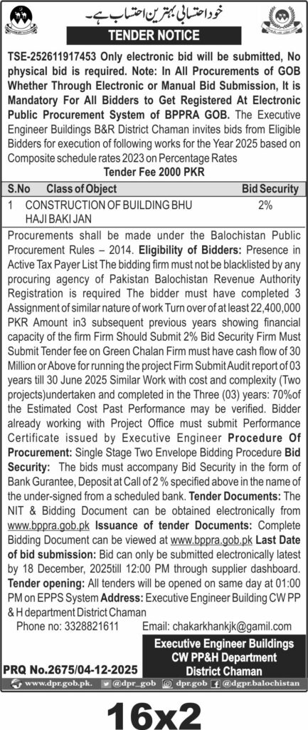 Tender documents are available electronically at bppra.gob.pk. Bids must be submitted electronically by 18 December 2025 at 12:00 PM. The tender opening will be held the same day at 1:00 PM on EPPS system. Contact details and submission instructions are provided by the Executive Engineer Buildings CW PP&H Department District Chaman.