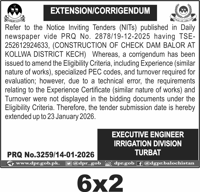 The submission deadline is set for 23 January 2026, with bids opening shortly after. Interested parties must submit sealed bids physically at the office of the Executive Engineer, Irrigation Division Turbat. Ensure your Call Deposit Receipt (CDR) and technical bid documents are complete and submitted on time.