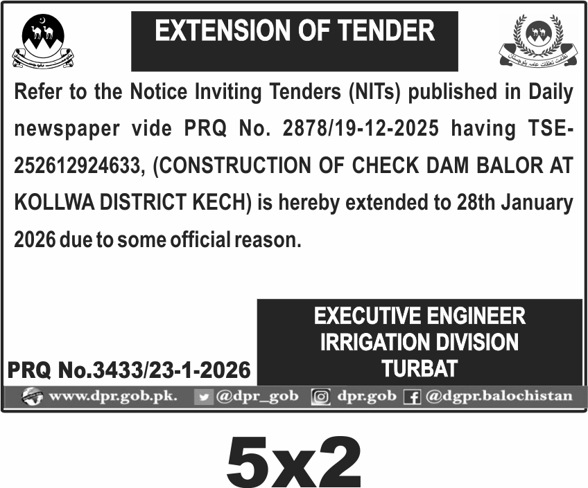 The submission deadline is extended to 28th January 2026, with bids opening shortly after. Interested parties must submit sealed bids to the office of the Executive Engineer, Irrigation Division Turbat, before the deadline. Late submissions will not be entertained.