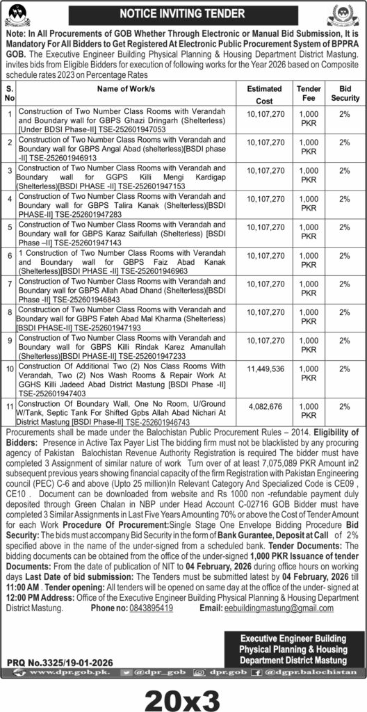 The submission deadline is set for 04 February 2026 by 11:00 AM, with tender opening at 12:00 PM the same day. Bids must be submitted physically at the office of the Executive Engineer Building Physical Planning & Housing Department District Mastung.