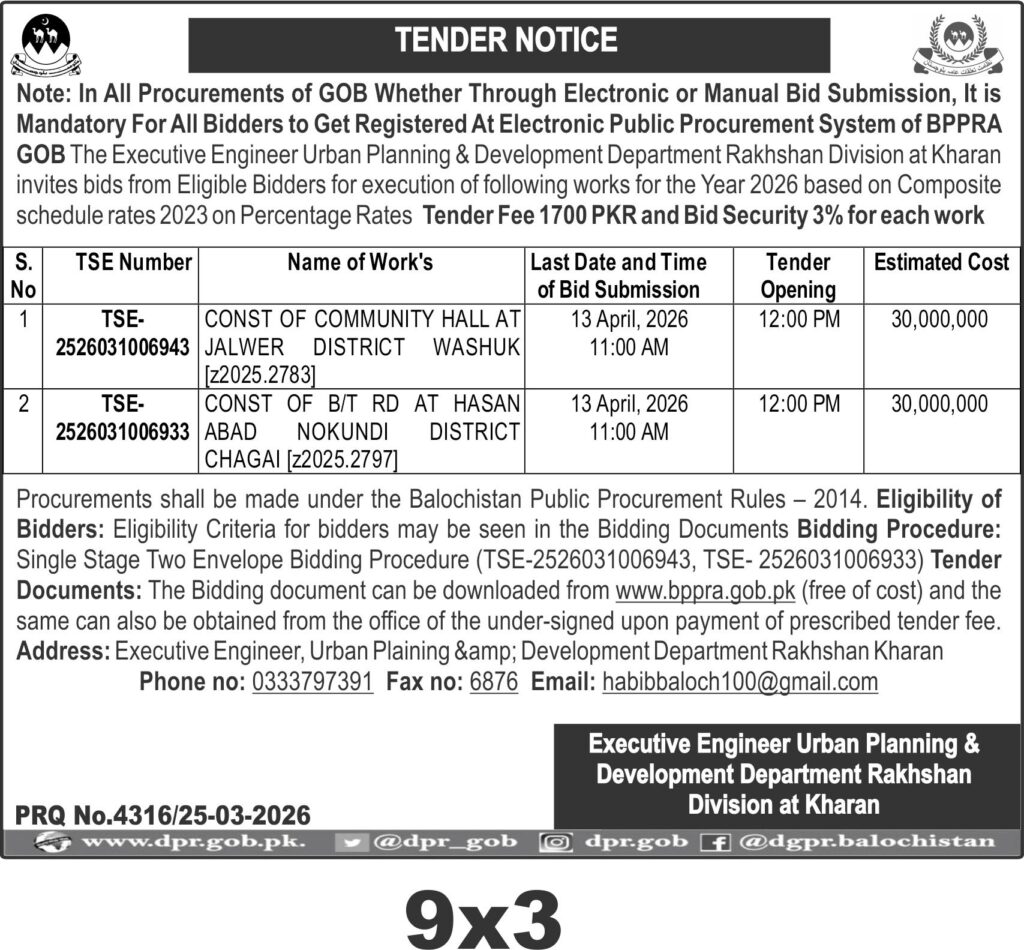 The submission deadline is set for 13 April 2026 at 11:00 AM, with tender opening at 12:00 PM on the same day. Bids must be submitted physically to the office of the Executive Engineer Urban Planning and Development Department Rakhshan Division at Kharan. Interested bidders should ensure timely delivery to avoid disqualification.
