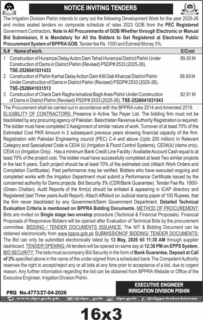 The Irrigation Division Pishin is procuring construction works for multiple Delay Action Dams in District Pishin for the fiscal year 2025-26. The projects include the Construction of Huramzai Delay Action Dam, Pishin Karhai Delay Action Dam, and Check Dam Ragha Ismailzai Bagh Area. These works are part of the revised PSDP# 2533 (2025-26) and involve significant civil construction activities focused on dam infrastructure.