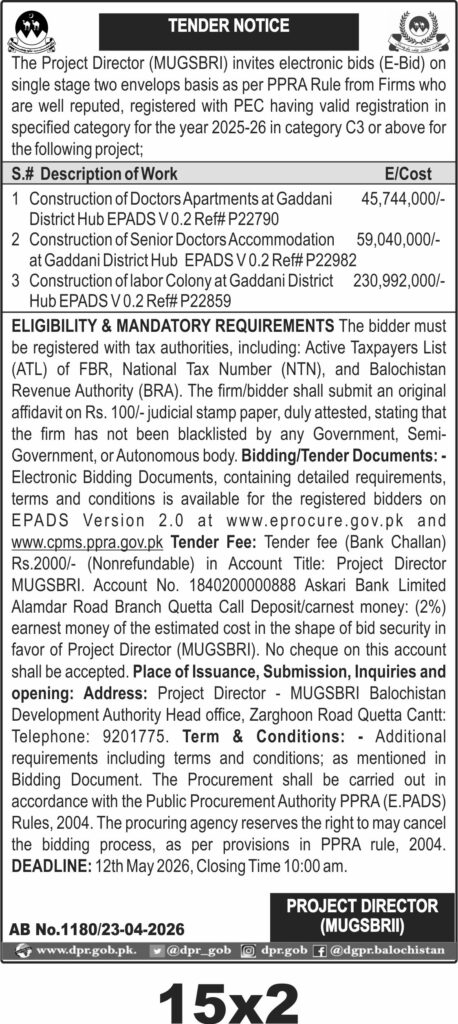 The Balochistan Development Authority, through its Project Director (MUGSBRI) based in Quetta, invites reputable firms to participate in the construction of multiple residential projects at Gaddani District Hub. The scope includes building Doctors Apartments, Senior Doctors Accommodation, and a Labor Colony, reflecting a significant infrastructure development effort in the region.