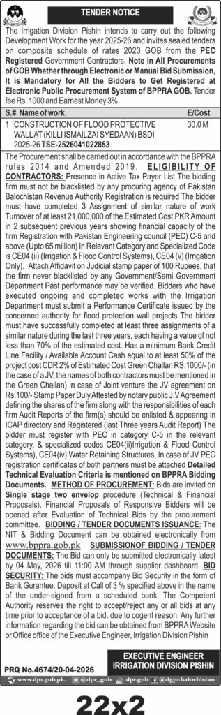 The Irrigation Division Pishin is procuring the construction of a flood protective wall at Killi Ismailzai Syedaan BSDI for the fiscal year 2025-26. This project involves civil works focused on flood control infrastructure in Pishin, Balochistan. The scope includes building a robust flood protective wall to safeguard the area from flood risks, following the composite schedule of rates 2023 issued by the Government of Balochistan (GOB).