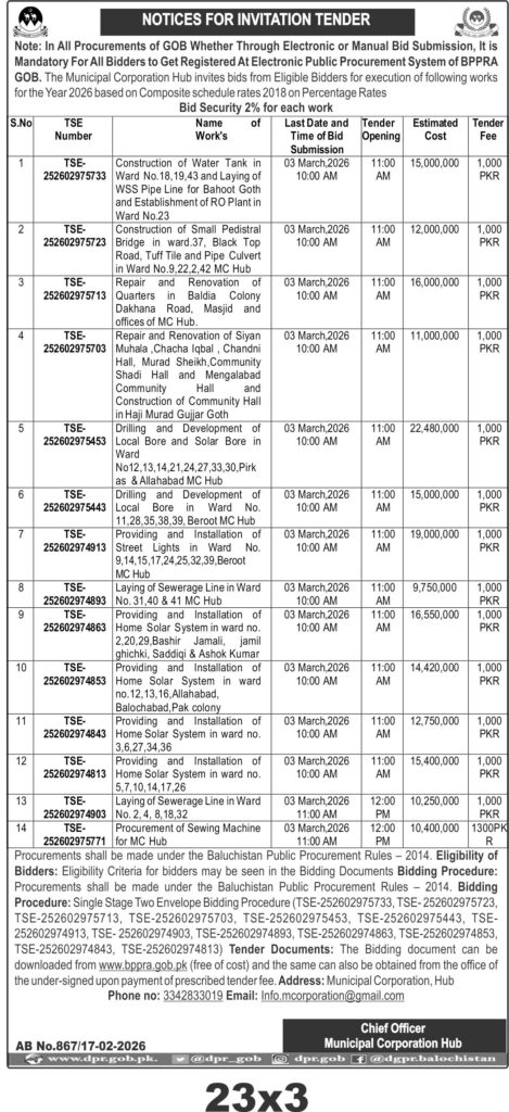 This tender from the Municipal Corporation Hub in Balochistan covers a diverse range of construction and installation projects including water tanks, small pedestrian bridges, road works, sewerage lines, and solar home systems. The scope also includes renovation of community halls and quarters, as well as development of local and solar bore wells across various wards in Hub.