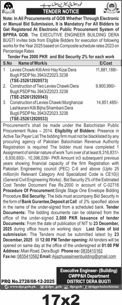 Eligibility requires active tax payer status, no blacklisting, PEC C-6 registration with relevant category CE10(i), and financial capacity proof. Bids must be submitted by 23 December 2025 at 12:00 PM with opening at 1:00 PM at the office on Mian Road, Dera Bugti.