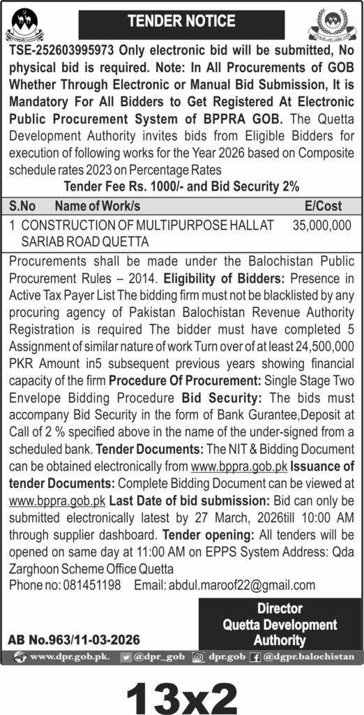 This tender from the Quetta Development Authority invites bids for the construction of a multipurpose hall located on Sariab Road, Quetta. The project falls under the Construction & Civil Works category and is a significant infrastructure development in Balochistan's capital city.