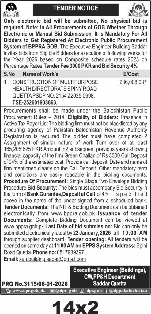 Contractors should ensure their PEC registration category aligns with the project requirements and maintain an active FBR/ATL status for the fiscal year 2025-26. The tender documents are available electronically at www.bppra.gob.pk, where bidders can also submit their bids. The submission deadline is strictly by 10:00 AM on 22 January 2026, with bid opening at 11:00 AM the same day via the EPPS system.