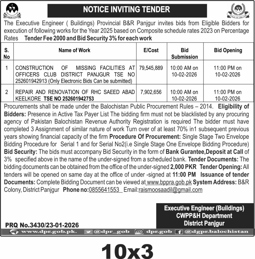 The submission deadline is set for 10:00 AM on 10th February 2026, with bid opening at 11:00 PM the same day. Bids must be submitted electronically for the Officers Club project and via the specified envelope procedure for the RHC. Tender documents are available at the B&R Colony office, District Panjgur, and can be reviewed online at www.bppra.gob.pk.