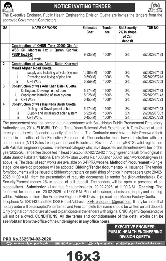 This tender invites contractors in Quetta from the Public Health Engineering Division for construction works involving a 20,000-gallon OHSR tank and water supply systems with solar power installations. The projects include civil works, drilling and development of bores, supply and installation of solar systems, and pipeline laying. These works are critical for improving water infrastructure and sustainable energy use in the region.